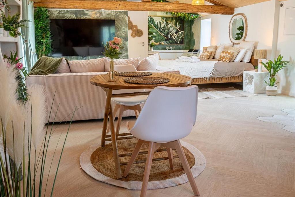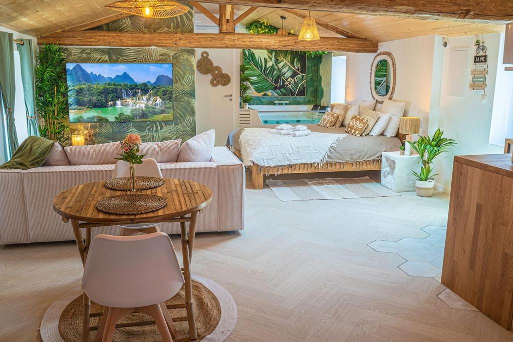 Après une journée d'exploration, laissez-vous séduire par le bain à remous, un véritable écrin de détente où vous pourrez savourer des instants complices à la lueur des bougies. Le Loft dispose d'une chambre king size confortable, d'une cuisine entièrement équipée et d'un coin salon chaleureux, parfait pour partager un bon verre de vin après avoir savouré un repas fait maison. Cet havre de paix, noté 8,9 par les couples, est l'endroit rêvé pour créer des souvenirs mémorables à deux. Venez vivre la magie de Narbonne dans ce cocon romantique !